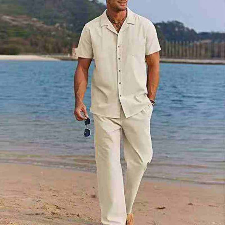 美式夏季男士仿亚麻沙滩休闲短袖衬衫+直筒裤两件套,独立包装,码数L-2XL码...