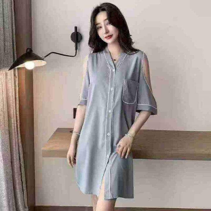 ① 网红冰丝性感露肩韩版宽松家居睡裙!独立包装,整款五色,有部分长袖款...
