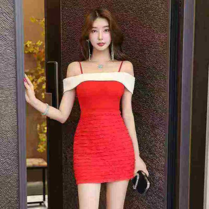 74条韩版一字肩性感吊带晚礼服包臀短款低胸气质高端名媛拼色连衣裙显瘦,尺...