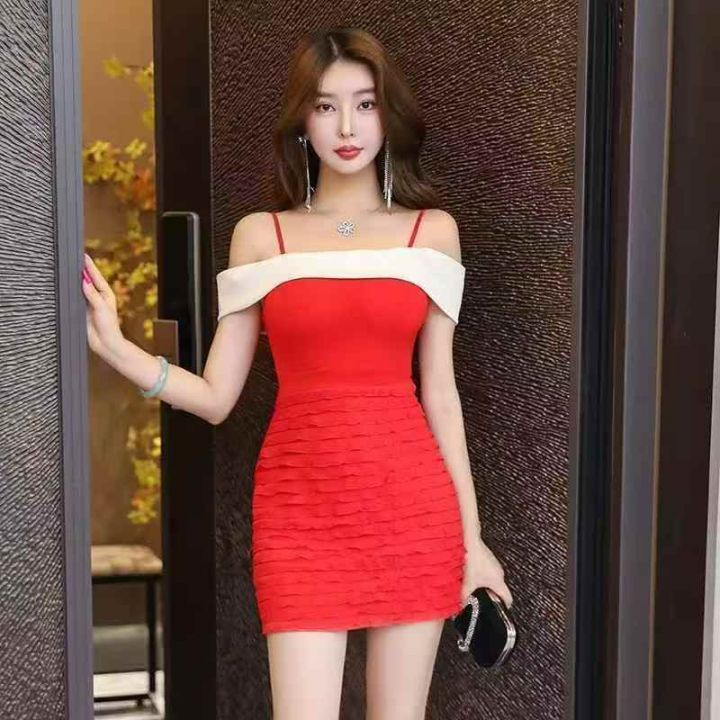74条韩版一字肩性感吊带晚礼服包臀短款低胸气质高端名媛拼色连衣裙显瘦,尺...