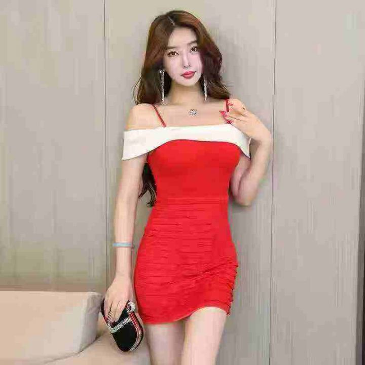 74条韩版一字肩性感吊带晚礼服包臀短款低胸气质高端名媛拼色连衣裙显瘦,尺...