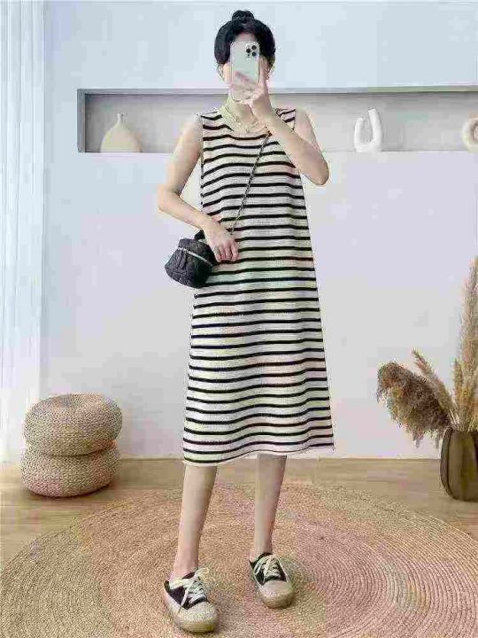 春夏季新款法式无袖气质显瘦长裙条纹开叉针织背心连衣裙,大货主要杏色为主...