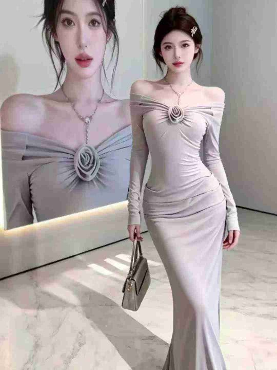 性感一字肩鱼尾连衣裙67件10.8,面料舒适高弹力,立体花朵,褶皱设计,码数...