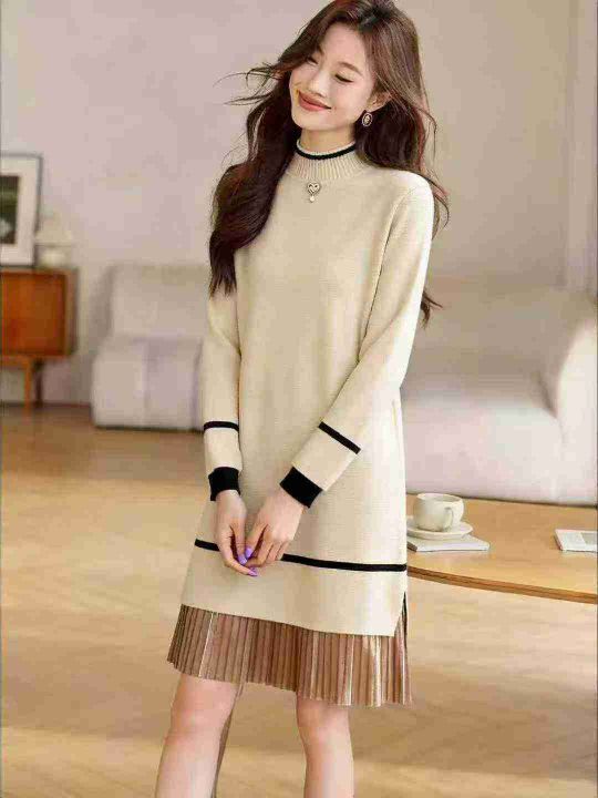 冬季新款配大衣中长款加绒加厚拼接宽松半高领针织连衣裙,独立包装带吊牌,...