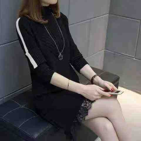 冬季新款配大衣中长款加绒加厚蕾丝边拼接宽松半高领针织连衣裙,独立包装带...
