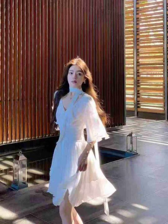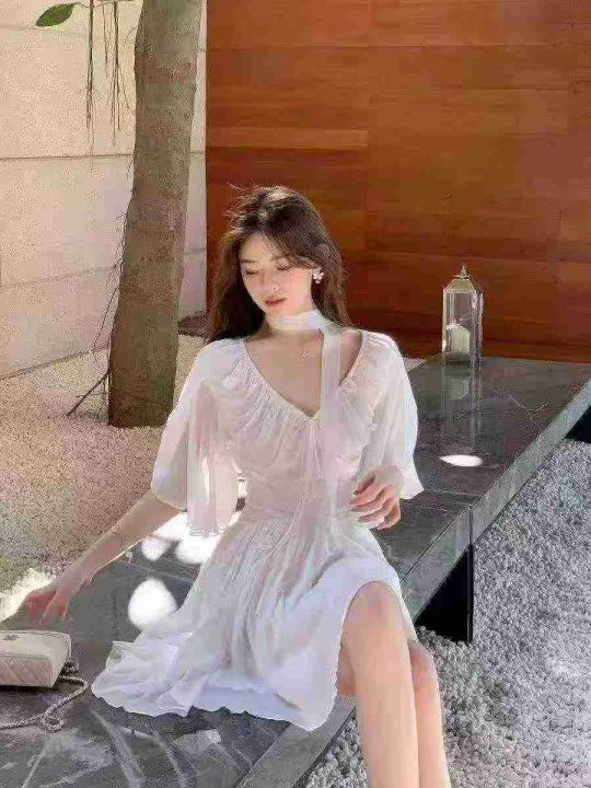 ☕️高品质夏季新款气质薄纱v领喇叭袖白色连衣裙短款收腰荷叶边仙女裙70条...