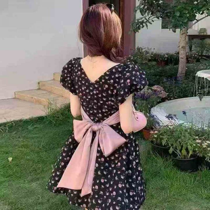 法式复古桔梗碎花连衣裙2025夏季新款蝴蝶结收腰显瘦a字裙,单款单色,2.3.4...