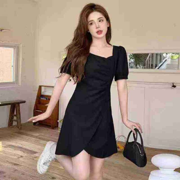 法式气质不规则小黑裙女赫本风方领短袖连衣裙,整款两色,品质好,有独立包...