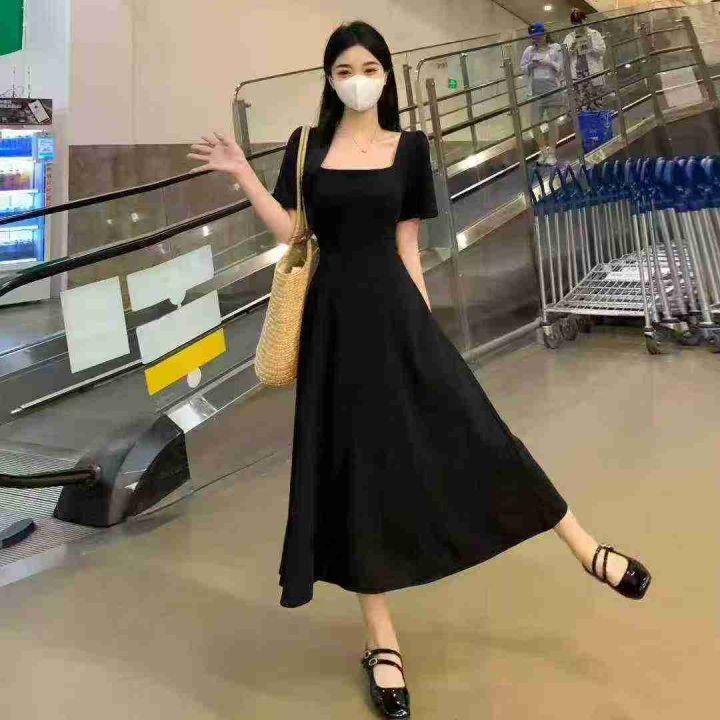 碎花裙女夏季新款女长款修身显瘦方领短袖小黑裙子法式收腰连衣裙260件,独...