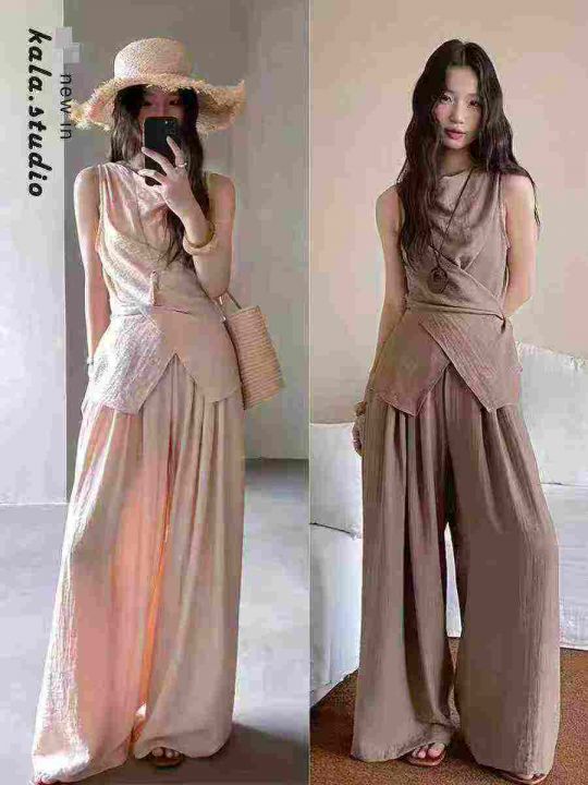 法式套装☕️会呼吸麻感背心绑带上衣女夏松紧腰宽松休闲裤裙套装 315套全清...