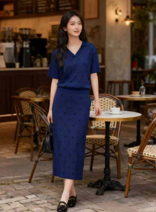 捡漏款,品牌原单早秋新款Polo领针织短袖T+针织半身长裙2件套,均码面料柔...