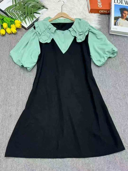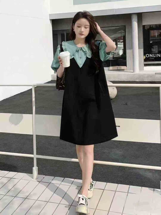 全清价8.9假两件娃娃领女减龄休闲宽松显瘦小个子学院风连衣裙,独立包装,...
