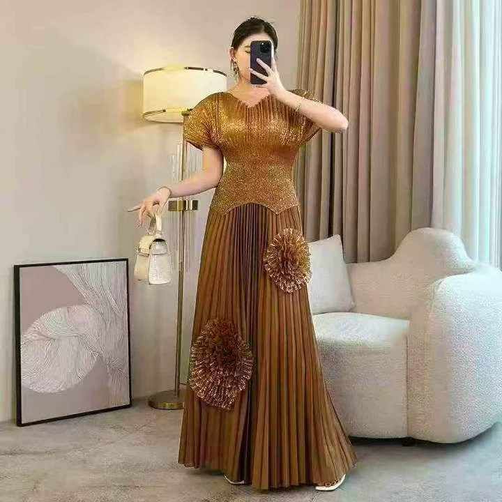 100套左右三宅轻奢重工烫金大盘花长半裙褶皱两件套收腰短袖蝙蝠衫两件套!...