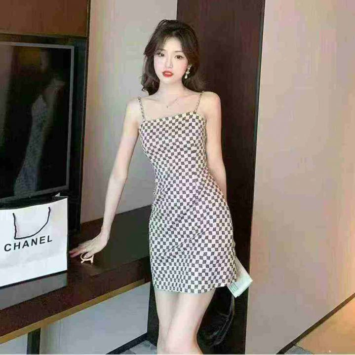 全清7.8设计感链条吊带连衣裙女2025夏季新款性感气质修身显瘦格子包臀裙,2...
