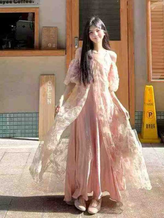 全清价8.8蝴蝶印花吊带连衣裙小仙女露肩宽松显瘦超仙气质长裙,独立包装,...