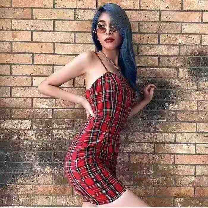 欧美风新款复古红格子高腰修身吊带裙短裙连衣裙,独立包装,250件,S-XL,...