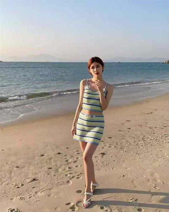 夏季新款辣妹性感撞色条纹针织背心+条纹针织短裙2件套,独立包装,码数XS--...