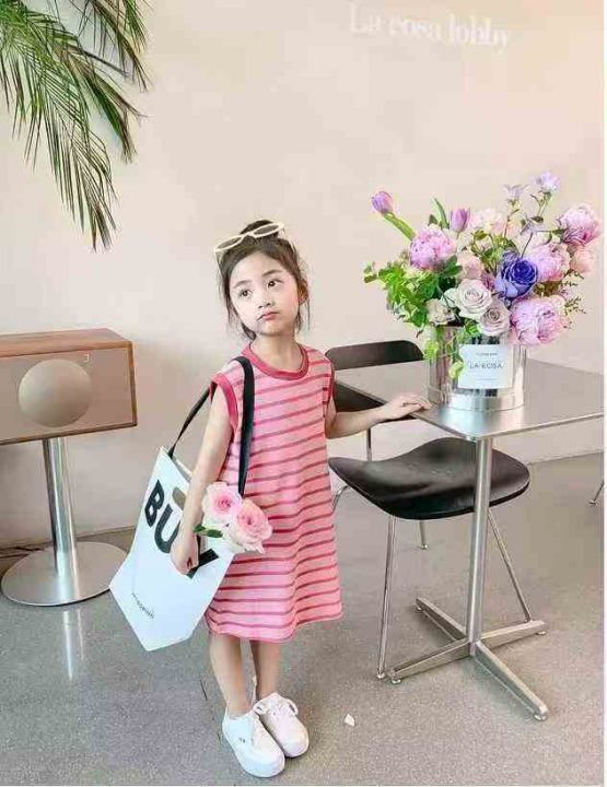 230件左右女童无袖粉色条纹长款T恤韩版夏季2025新款儿童连衣裙,面料柔软舒...
