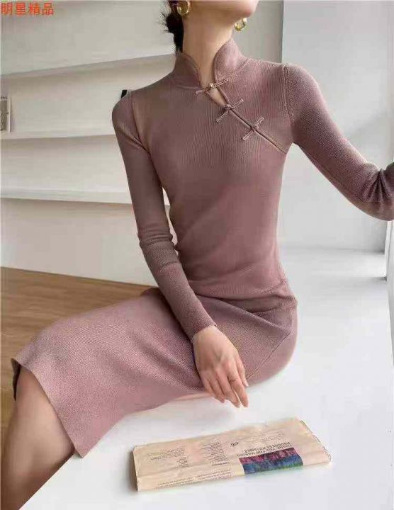 新中式国风盘扣旗袍毛衣连衣裙,女包臀开叉长裙,码数均码,全部有吊牌,独...