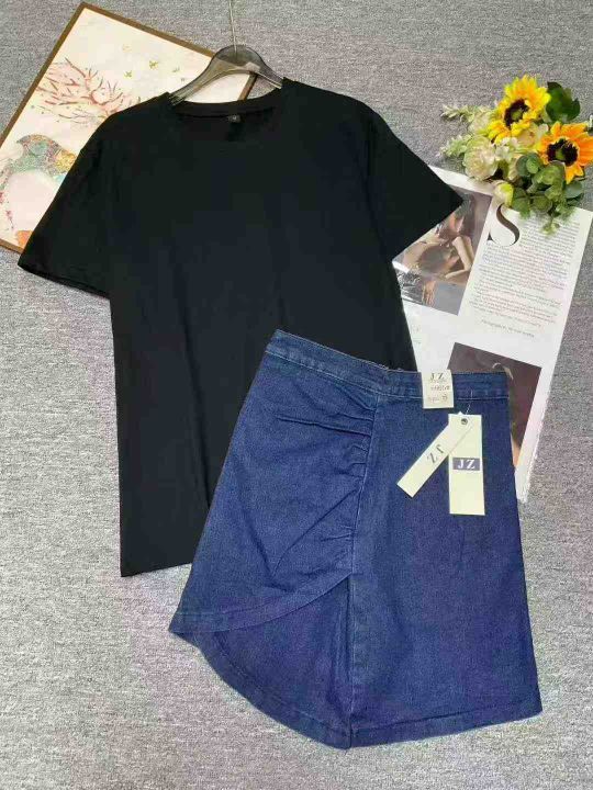 夏季新款胖妹妹弹力设计款牛仔半身裙+宽松纯棉大版T桖2件套,独立包装带吊...