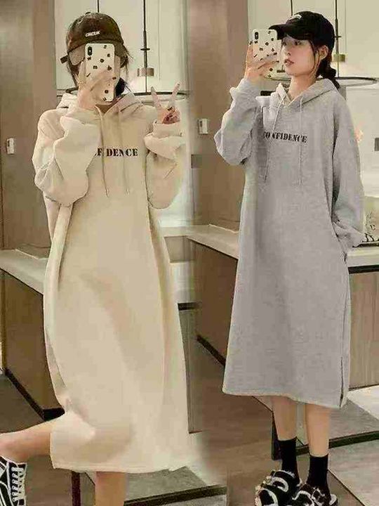 连帽卫衣宽松大码加绒加厚保暖中长款过膝连衣裙外套,侧边口袋设计,双层帽...