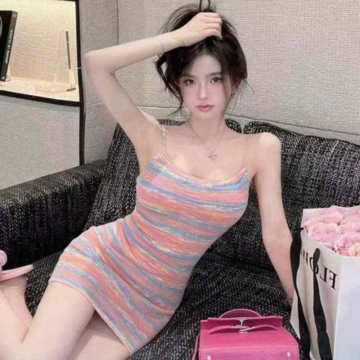夏季新款撞色彩虹条纹辣妹性感针织吊带连衣裙,独立包装,均码面料柔软舒适...