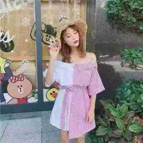 ☕️韩版小性感一字领露肩拼色吊带裙条纹短袖连衣裙337件全清10.8元分货➕1...