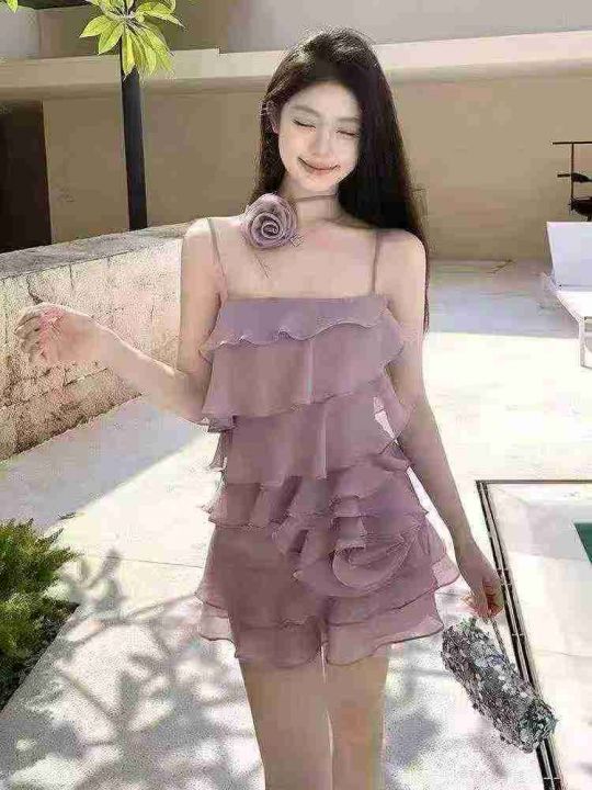 ☕️仙女裙辣妹不规则荷叶边吊带连衣裙短款花朵纯欲海边度假一字领雪纺连衣...
