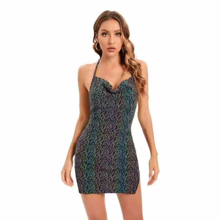 6.8清130件跨境亚马逊夏季时尚彩色反光吊带挂脖性感辣妹连衣包臀裙 码数S-M...