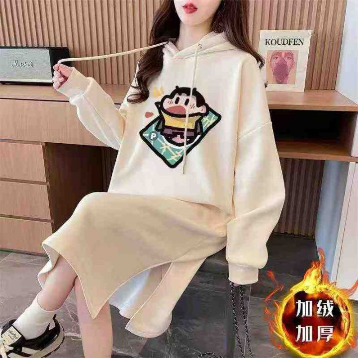 连帽卫衣宽松大码加绒加厚保暖中长款过膝连衣裙外套,侧边口袋设计,双层帽...