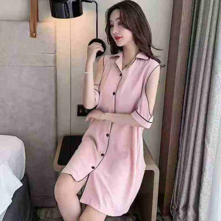 ① 网红冰丝性感露肩韩版宽松家居睡裙!独立包装,整款五色,有部分长袖款...