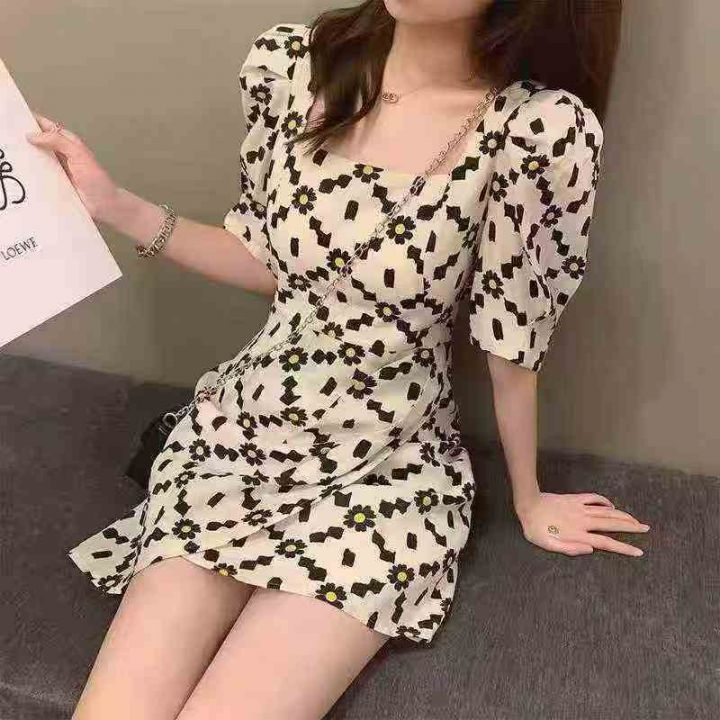 全清价6.9元热卖雏菊泡泡袖名媛气质显瘦短袖裙方领设计感连衣裙,独立包装...