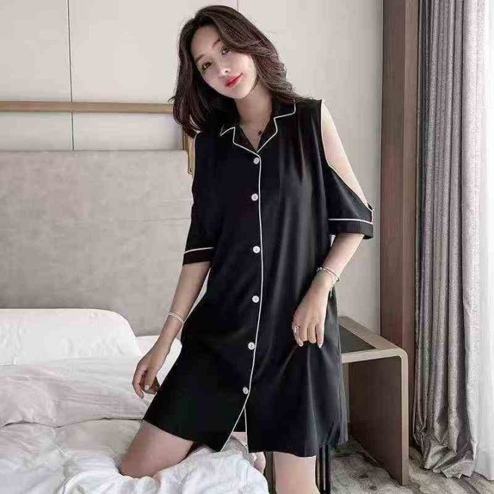 ① 网红冰丝性感露肩韩版宽松家居睡裙!独立包装,整款五色,有部分长袖款...