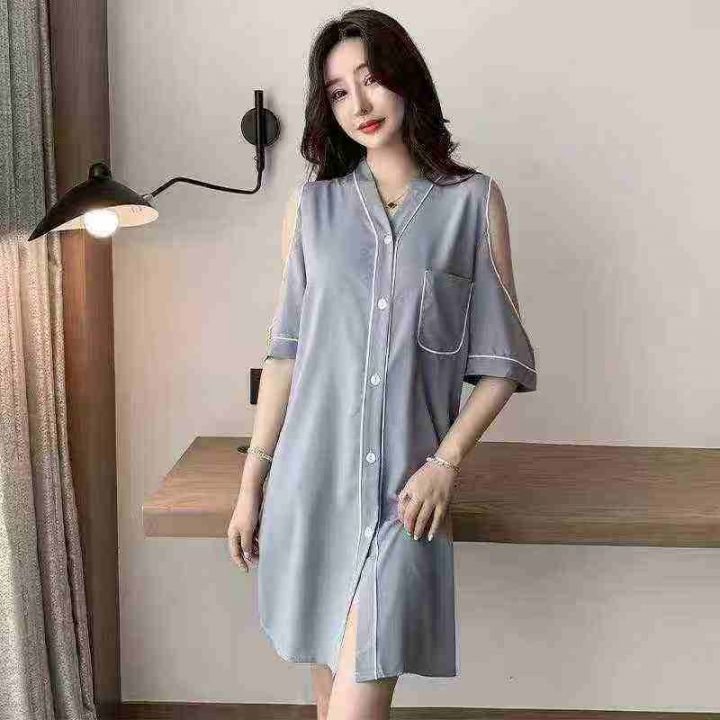 ① 网红冰丝性感露肩韩版宽松家居睡裙!独立包装,整款五色,有部分长袖款...