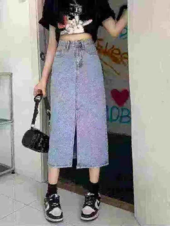 高腰显瘦前开叉牛仔中长款半身裙,单款两色,浅蓝色款款多,蓝色少量,数量...
