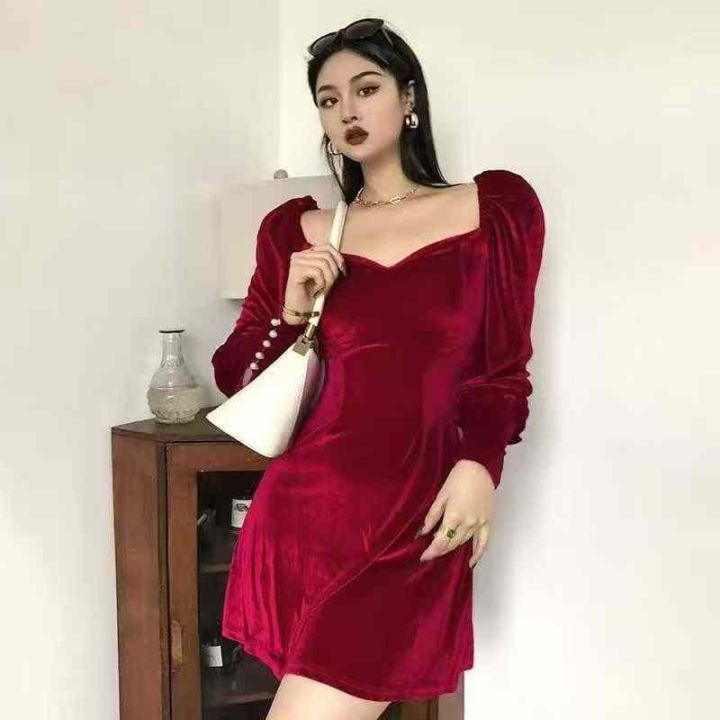 天猫店下架一批法式赫本风方领丝绒连衣裙女轻奢气质名媛收腰显瘦开叉修身连...