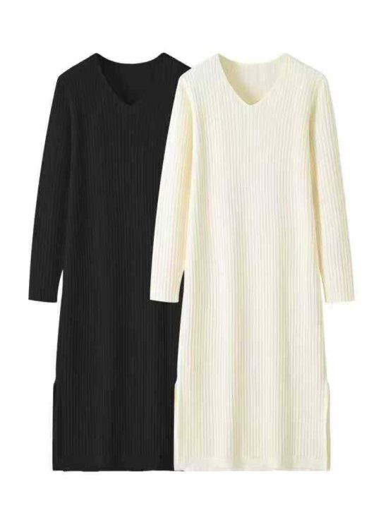 法式新款御姐风毛衣秋冬季显瘦裙v领打底裙中长款开叉小设计针织连衣裙,面...