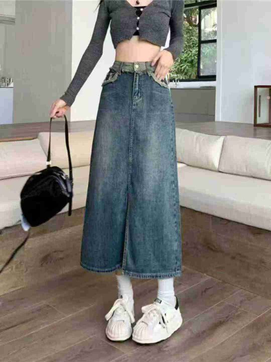 ☕️牛仔长裙夏季新款高腰设计感小众毛边开叉A字牛仔半身裙蓝色裙子女100条...