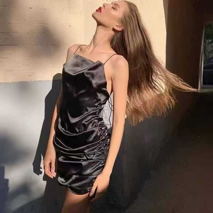 12清1000,性感缎面吊带连衣裙女夏新款轻奢名媛褶皱设计感别致收腰包臀裙子...