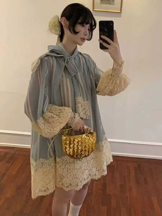 周雨彤庄洁同款法式重工拼接蕾丝连衣裙条纹衬衫裙女,码数 XS S M L ,全部...