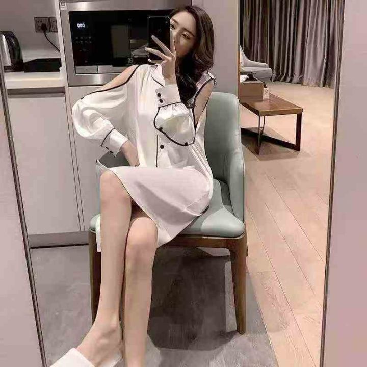 ① 网红冰丝性感露肩韩版宽松家居睡裙!独立包装,整款五色,有部分长袖款...
