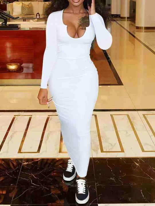 9.9清欧美辣妹时尚性感U领长袖连修身显瘦长款连衣裙,整款多色,数量300条...