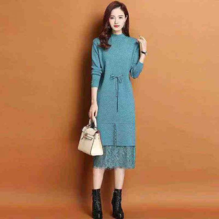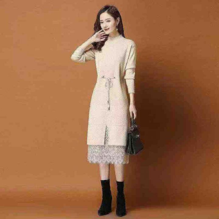 捡漏款秋冬新款高级感收腰显瘦法式蕾丝拼接毛衣连衣裙,独立包装,均码面料...