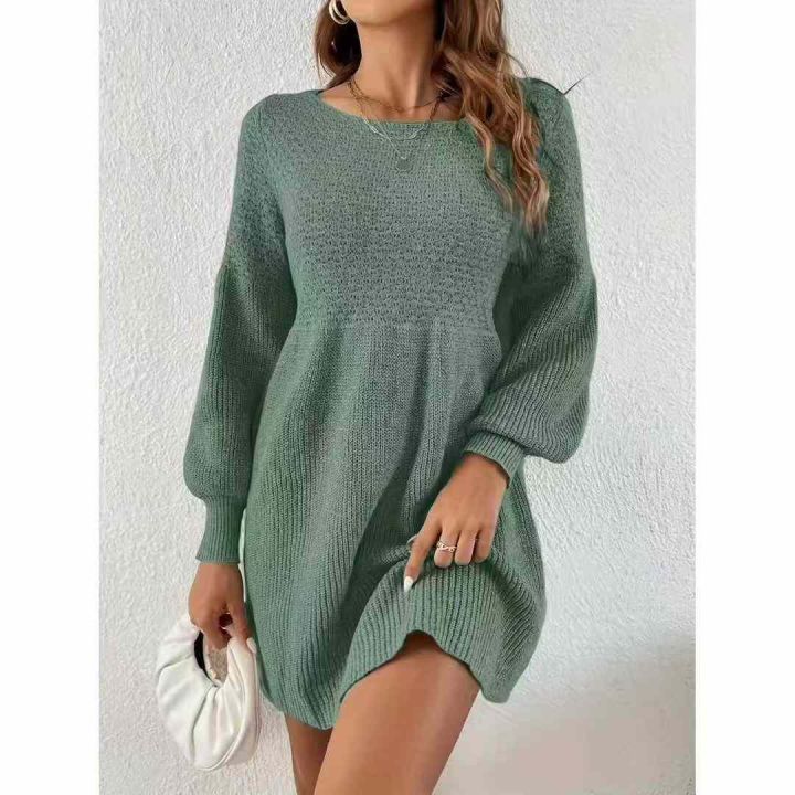 秋冬新欧美风宽松纯色粗针灯笼袖高腰A字圆领毛衣连衣裙,独立包装,码数S--...