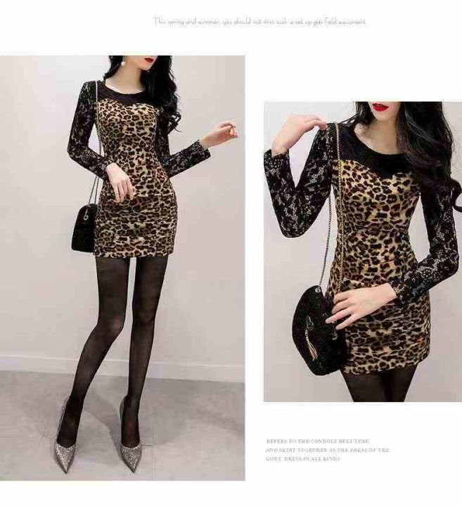 65条左右春季新款连衣裙性感豹纹拼蕾丝包臀长袖连衣裙!高弹力!尺码S-L,...