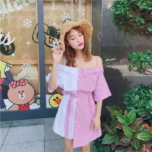 ☕️韩版小性感一字领露肩拼色吊带裙条纹短袖连衣裙337件全清12.5元分货13....