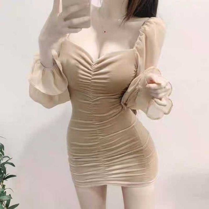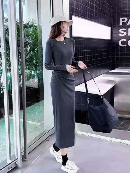 ☕️气质收腰显瘦褶皱连衣裙女春秋新款休闲感长袖基础款打底t恤长裙 70件全...