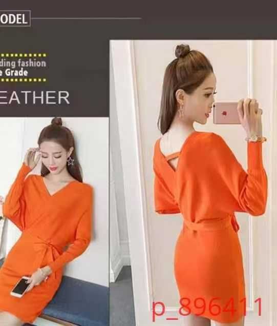 时尚性感女人味V领短袖编蝠袖连衣裙高腰绑带修身显瘦包臀针织毛衣裙,实物...