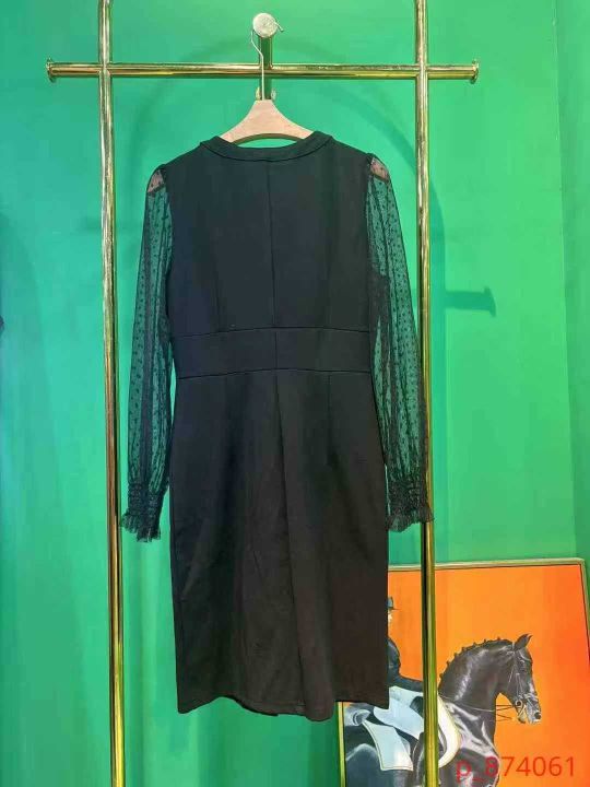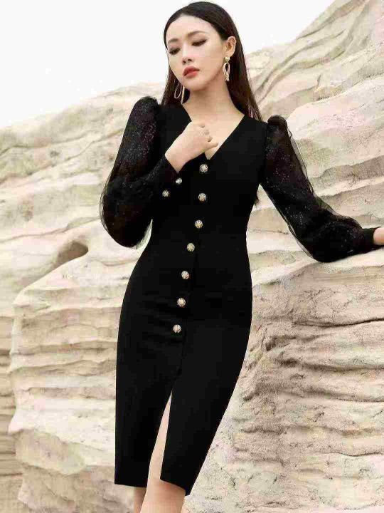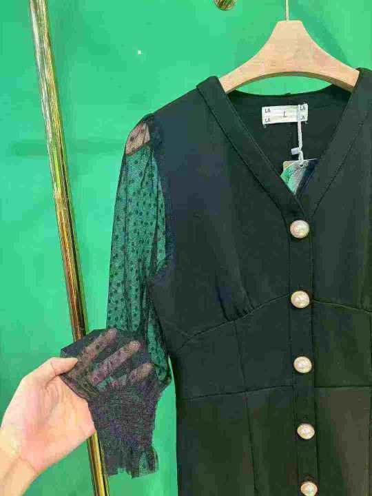 130件左右春秋新款气质黑色设计感泡泡袖V领修身中长款连衣裙!尺码S-XL高弹...