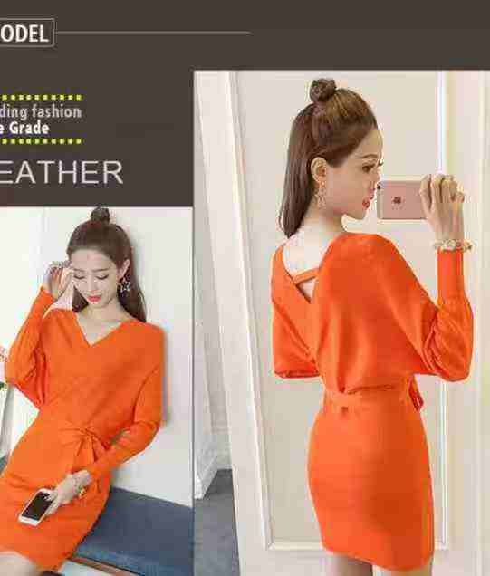 时尚性感女人味V领短袖编蝠袖连衣裙高腰绑带修身显瘦包臀针织毛衣裙,实物...